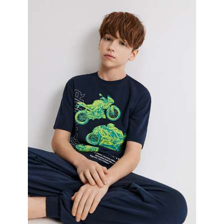 Пижама со штанами для мальчика — незаменимая деталь гардероба для комфортного сна и отдыха. Пижамный комплект с принтом мотоциклов обязательно понравится юному любителю мотоспорта. Детская пижама состоит из футболки с принтом и брюк. Свободная футболка со спущенной линией плеча и удлиненными рукавами обеспечивает удобное ношение и позволяет принять удобное для сна положение. Модель украшена принтом на тему мотоспорта с воодушевляющими надписями "MOTOR ROAR | SPEED THRILLS | ROARING ENGINES, BURNING RUBBER, FIERCE RIVALS. ADRENALINE FUELS THE RACE. BE FEARLESS. RIDE FAST, CHASE DREAMS, LEAVE DUST BEHIND" [англ. - "Рёв мотора | Скорость захватывает | Громкие двигатели, горящая резина, ожесточенные соперники. Адреналин подпитывает гонку. Будь бесстрашным. Поезжай быстро, преследуй мечты, оставь пыль позади"]. Просторные пижамные брюки с поясом на резинке комфортно садятся на разные типы фигуры, а манжеты по низу штанин прилегают к телу и помогают сохранять тепло. Пижама подойдет для сна и домашнего отдыха, а также станет суперактуальной для пижамной вечеринки с друзьями.