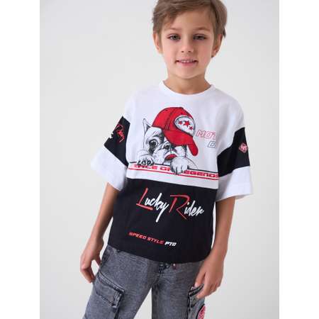 Детская футболка оверсайз для мальчика. Модель выполнена из эластичного хлопкового трикотажа джерси. Крупный принт и нашивки в гоночной тематике. Горловина круглая, обработана эластичным рибом.