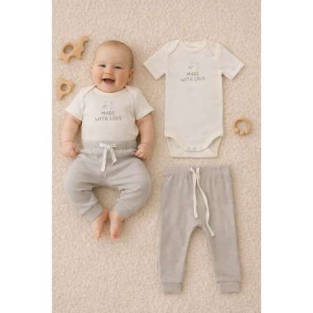 Материал устойчив к частым стиркам, сохраняет форму, мягкость и цвет. Нежная базовая цветовая гамма и лаконичный принт делают комплект универсальным и подходящим как для мальчиков, так и для девочек. Такой комплект станет отличной основой гардероба новорождённого и подойдёт для повседневного использования.