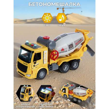 Дверцы кабины открываются, боковые зеркала прорезиненные, мягкие. Игрушечная машинка изготовлена из прочных и безопасных материалов в качественном исполнении. Комплектация. Бетономешалка, лопата.