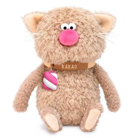 Очаровательный котик Какао из тактильно приятного эко меха цвета какао с молоком. Лапки и хвостик из более короткого меха. Усики из шелковистого крученого шнура. Объемный носик обтянут розовым софтом. Глазки из пластика. На пяточках и внутри ушек вшит сливочный софт. На шейке у котика силиконовый чокер с именем и подвесом в виде бело-розовой карамели-тянучки. Чокер легко снимается и может послужить в качестве модного браслета для друга.
