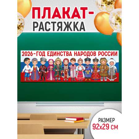 Плакат-полоска «2026 – год единства народов России» создан для яркого и содержательного оформления детский сад и школа. Удлинённый формат длина до 1 м позволяет разместить его над доской, вдоль стены или над входом, создавая праздничный акцент и подчёркивая важность даты. Плотный картон сохраняет форму, не провисает, выглядит аккуратно и солидно даже при частом использовании. На фоне триколора выстроен красочный хоровод детей в национальных костюмах разных регионов: вышитые рубахи и сарафаны, узорчатые пояса, меховые шапки, тёплые шубки, яркие платки, аккуратные сапожки. Каждый образ прорисован детально: орнаменты на подолах, пояса с золотистыми вставками, контрастные воротники, шапки с узорами и меховой отделкой. Такой плакат народы России превращает обычный класс в наглядный уголок дружбы и уважения к традициям. Изображение помогает объяснить детям, что год народного единства – это не просто дата в календаре, а праздник взаимопонимания, поддержки и гордости за многонациональную страну. Плакат-полоска удобен для классных руководителей, воспитателей, педагогов дополнительного образования, организаторов школьных и садовских мероприятий. Он подходит для оформления тематических недель, патриотических уголков, утренников, конкурсов, внеклассных занятий. Качественная печать даёт насыщенные цвета, текст легко читается издалека, лица персонажей добрые и открытые, поэтому дети воспринимают материал с интересом. Картон устойчив к выцветанию, изделие можно использовать несколько лет подряд, сочетая с другими элементами декора. Такой плакат – полоска выгоден тем, что одновременно украшает помещение, служит учебным пособием и создаёт атмосферу праздника. Добавьте в пространство группы или класса этот выразительный акцент, чтобы тема единства стала для детей живой, понятной и по-настоящему вдохновляющей.