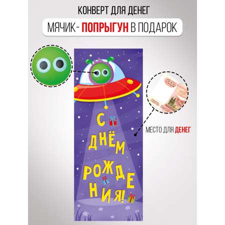 Подарочный конверт для денег – отличный способ сделать практичный и запоминающийся подарок на день рождения! Яркий дизайн с летающей тарелкой и инопланетянином, надпись «С днем рождения!» и небольшое пожелание дают возможность использовать конверт в качестве открытки мальчику и девочке. Отличительной особенностью является подарочный мячик-попрыгунчик, который сразу привлечет внимание ребенка! Создайте прыгательное настроение! Конверт для денег с оригинальным дизайном станет идеальным дополнением к любому подарку или самостоятельным презентом. Ведь детям важно не только содержимое подарка, но и обёртка. В конверт евроформата помещается необходимое количество денег разного номинала или сертификат. Получив в подарок определенную сумму, ребенок сделает собственный выбор – сколько потратить и на что. Хороший способ на практическом примере обучить финансовой грамотности. Благодаря применению качественных материалов изображение не потускнеет, а прочный картон станет надежным хранилищем для денежного сюрприза. Индивидуальная прозрачная полиэтиленовая упаковка защитит открытку от загрязнения и мелких повреждений декоративного элемента при транспортировке. Креативный конверт с сюрпризом надолго запомнится имениннику или имениннице!