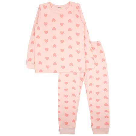 Комплект детской пижамы, состоящий из кофты с длинными рукавами и брюк. Выполнена из 100% хлопка в рубчик, украшена принтом с сердечками. Доступна в размерах от 80 до 98.