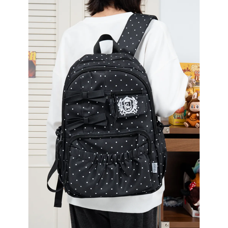Эстетичный и модный портфель для школы станет отличным выбором для девочки подростка. Такой стильный аксессуар легко подчеркнет индивидуальность и добавит особый шарм в образ ученицы любого класса, будь то 5 или 6. Принт бантики на ткани придают изделию корейский акцент, вдохновленный популярными аниме трендами. Эта модель отлично подходит не только для учебы, но и для повседневных городских прогулок или путешествий. Милый женский вариант ранца выполнен из прочного тканевого материала, обладающего водоотталкивающими свойствами. Большая вместительность делает такой вариант практичным решением для колледжа или старших классов. Внутренний отсек дополнен удобными отделениями, что помогает поддерживать порядок среди вещей подростка. Широкие плечевые лямки равномерно распределяют вес по плечу, снижая нагрузку на спину даже при длительном ношении. Модный городской рюкзак y2k станет отличным помощником для активного школьника: он вместителен, практичен и долговечен.