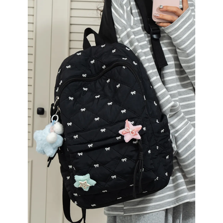 Эстетичный и практичный рюкзак для школы в любой класс, прогулок или путешествий станет стильным аксессуаром для девочки, мальчика и подростков. Его изысканный принт в виде маленьких бантиков добавляет нежности и утонченности. Привлекательные декоративные элементы подчеркивают корейский y2k стиль.