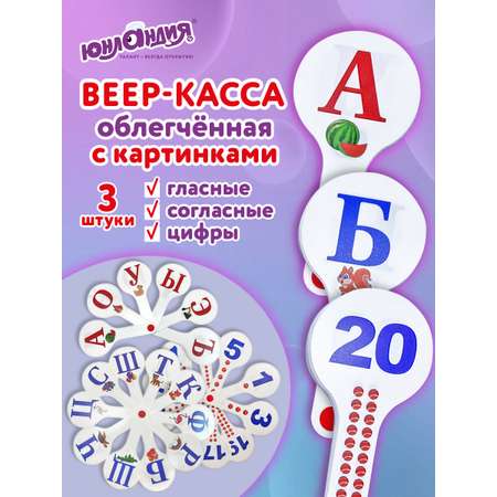Веер-касса с картинками (гласные, согласные, цифры) от ЮНЛАНДИЯ – отличный счетный материал, который помогает детям, дошкольникам и первоклассникам легко учить буквы и цифры в игровой форме. Облегчённые и гибкие веер-кассы созданы специально для детского сада и школы, позволяя быстро освоить буквы русского алфавита и цифры от 1 до 20. Яркие картинки с двух сторон делают процесс обучения увлекательным, развивают ассоциативное мышление и способствуют лучшему запоминанию. Этот набор из трёх школьных касс идеально подходит для занятий с детьми и малышами, которые учат буквы и цифры, а также помогает подготовиться к школе, делая обучение простым и эффективным. Незаменимое пополнение школьной канцелярии для максимально успешного учебного процесса!