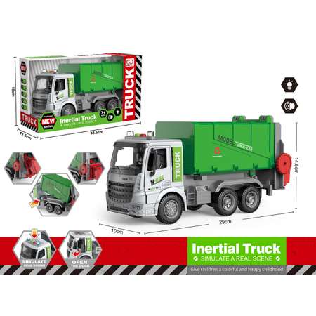 Игрушечный мусоровоз со звуковыми эффектами, подсветкой проблесковых маячков и имитацией загрузки мусора. Мусоровоз с движением вперёд и назад, фрикционный механизм, прорезиненные колеса, мусорные баки в комплекте. При нажатии кнопок на крыше кабины мусоровоза издаёт звуки гудка, заднего хода, заводящегося двигателя, манипулятора. При нажатии на боковой рычаг кузов поднимается. При прокрутке шестеренки, которая находится на боковой стороне кузова, шнеки внутри кузова прокручиваются. Дверцы кабины открываются, боковые зеркала прорезиненные, мягкие. У мусорных баков поднимаются крышки. Игрушечная машинка изготовлена из прочных и безопасных материалов в качественном исполнении. Комплектация. Машинка, 2 мусорных бака.