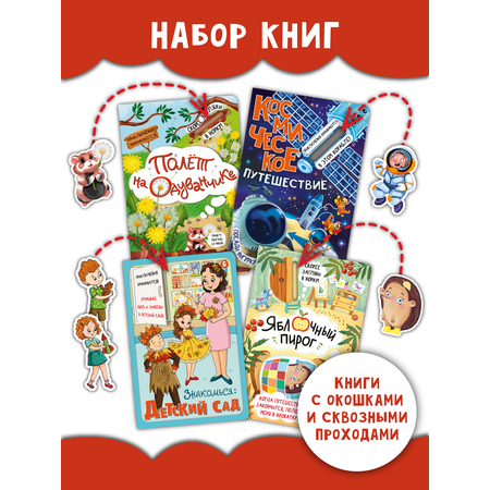 В наборе 4 книги: Знакомься: детский сад, Космическое путешествие, Яблочный пирог, Полет на одуванчике.