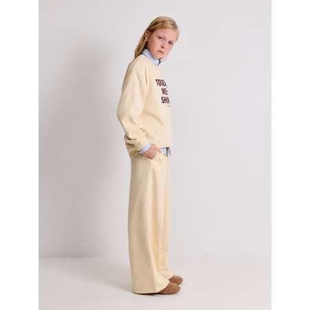 Широкие брюки для девочки-подростка займут прочное место среди модных элементов детского гардероба. Брюки выполнены из хлопкового из футера с петлями на изнанке (без начеса), что делает их подходящими для занятий спортом. Эластичный мягкий пояс на резинке обеспечивает комфортную посадку для разных типов фигуры и дополнительно регулируется шнурком. Вместительные карманы по бокам делают брюки ещё более практичными. Просторные брюки дополнены рельефными швами по переду, что делает их оригинальными и интересными. Комбинируйте модель со свитшотом из того же материала (20210170174), чтобы собрать модный и удобный костюм для девочки.