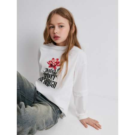 Белый лонгслив с двойным рукавом для девочки-подростка — стильный айтем для создания запоминающихся образов. Модель выполнена из мягкой кулирной глади, которая подходит для длительного ношения. Лонг COMFORT fit отличается свободным кроем для более комфортного ношения: в нем приспущена линия плеча, а также увеличен объем рукава. Все это позволяет легко двигаться и создает расслабленный модный силуэт. Удобная округлая горловина не мешает при одевании. Стильный и оригинальный акцент — двойные рукава со вставкой из кружева на уровне локтя. Также модель украшена принтом с изображением цветка и вдохновляющей надписью "Любовь видит сердцем". Комбинируйте лонгслив с трендовыми широкими джинсами, чтобы создать повседневный образ с нотками уникальности.