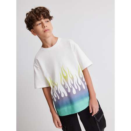 Детская белая футболка с принтом цветного пламени — верный способ внести яркую ноту в образ. Модель выполнена из натурального мягкого хлопка, который славится гипоаллергенными свойствами и подходит для длительного ношения. Трикотажная футболка посадки comfort предлагает свободный крой, приспущенную линию плеча, а также увеличенные объем и длину рукава. Такой крой создает расслабленный модный силуэт и подчеркивает непринужденность аутфита. Принт в виде цветного пламени оживляет лук и придает ему визуального интереса. Принт на водной основе надолго сохраняет яркость красок, благодаря чему будет долго радовать своим видом. Комбинируйте футболку с брюками карго и удобной обувью.