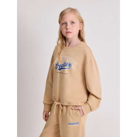 Свитшот для девочки-подростка выполнен из хлопкового футера с петлями на изнаночной стороне (без начеса), что делает его подходящим для занятий спортом или составления многослойных сложных образов. Свитшот посадки comfort, предполагающей свободный крой, приспущенную линия плеча, а также увеличенные объем и длину рукава. Удобная округлая горловина и манжеты рукавов выполнены из эластичного рибового полотна для лучшего прилегания к телу и сохранения тепла. По низу изделия расположена кулиска со шнурком для регулировки посадки. Свитшот украшен принтом с надписями "CHANGES CREATIVE | UNLEASH YOUR TALENT" [англ. - "Творческие перемены | Раскрой свой талант"]. Принт на водной основе сохраняет яркость цвета, а значит, будет долгое время радовать своими красками. Свитшот без начеса для девочек можно дополнить комплектными брюками (20240460020), чтобы собрать спортивный костюм для девочек. Модель представлена в двух цветах: графитовом и бежевом.