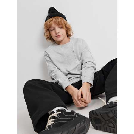 Свитшот оверсайз для мальчика сочетает в себе комфортный крой и стильные дизайнерские детали. Детский свитшот изготовлен из хлопкового футера с петлями на изнаночной стороне (без начеса), благодаря чему подходят для ношения в течение всего года. OVERSIZE fit — это объемная посадка моделей для создания ультрамодного образа. Свободный крой, скрывающий силуэт, заметно спущенная линия плеча и увеличенный объем рукавов дарят легкость движений и позволяют составлять многослойные сложные образы. Округлая горловина и манжеты рукавов из рибового полотна плотно прилегают к телу и сохраняют объемную форму. Оригинальный штрих модели придают наружные швы и необработанная линия низа, благодаря чему образ выглядит расслабленно и чуть небрежно. На груди также расположена декоративная вышивка "OPEN TO THE FUTURE" [англ. - "Открыт будущему"]. Стилизуйте свитшот для мальчика с брюками карго или джинсами для создания модного образа.