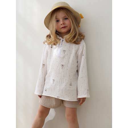 Летняя детская рубашка из легкого муслина для мальчика и для девочки - выбор заботливых родителей для своего ребенка на пляж и на море. В белой тунике с мелким принтом можно позволить малышу запрыгнуть в воду. Накидка от солнца задерживает агрессивные ультрафиолетовые лучи, каждый день защищает малышей от солнечных ожогов.