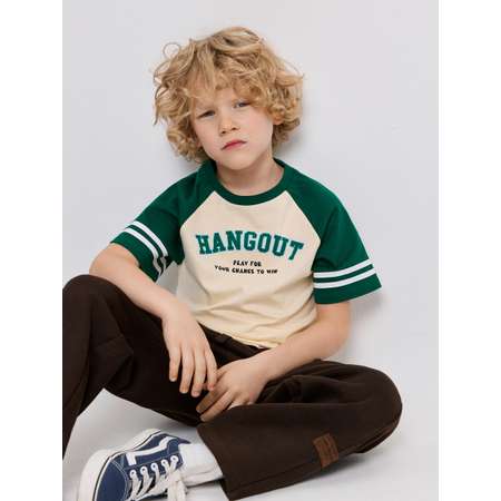 Спортивная футболка — поистине универсальный элемент детского гардероба, который подходит как для физической активности, так и для создания стильных образов. Детская футболка для мальчика представляет собой модель прямого кроя с контрастным рукавом реглан, который комфортно садится на плечи разной ширины. Белые полосы на рукавах подчеркивают спортивный стиль изделия. Кремовая футболка дополнительно украшена текстовым принтом "HANGOUT | PLAY FOR YOUR CHANCE TO WIN" [англ. - "Тусоваться | Играй и получай шанс выиграть"]. Спортивная футболка для мальчика поможет создать модный повседневный образ с брюками и наброшенным на плечи джемпером.