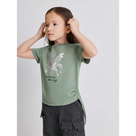 Футболка с единорогом и утяжками для девочки — актуальная и стильная модель, которая понравится юной любительнице легенд и сказок. Футболка изготовлена из мягкого и приятного на ощупь трикотажа, подходящего для повседневного ношения. Изделие посадки regular предполагает прямой силуэт со стандартной линией плеча, а значит, классическую посадку по фигуре. Оригинальности и стиля футболке придают кулиски с утяжками, расположенные в боковых швах. Спереди расположен блестящий серебристый принт с изображением единорога и надписью "LET DREAMS TAKE WINGS" [англ. - "Пусть мечты обретут крылья"]. Стилизуйте футболку с брюками карго и удобной обувью, чтобы составить модный образ на каждый день.