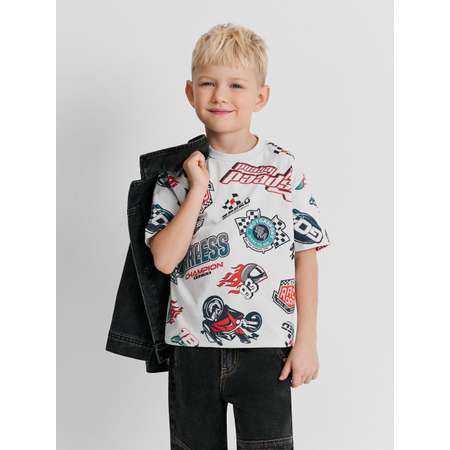 Детская футболка с принтом на тему мотогонок имеет все шансы стать любимой вещью в гардеробе мальчика. Модель выполнена из мягкого и приятного на ощупь трикотажного полотна, которое подходит для длительного ношения. Футболка посадки comfort предполагает свободный крой, приспущенную линию плеча, а также увеличенные объем и длину рукава. Такой крой не мешает активным детям двигаться, что особенно важно для юных непосед. Футболка украшена рисунками и надписями на тему мотоспорта: "SPEED LEGEND | WORLD CHAMPIONSHIP | RACE DAY | FULL OF ENERGY | SPEED TO WIN | BE THE NUMBER ONE" [англ. - "Легенда скорости | Чемпионат мира | День заезда | Полон энергии | Скорость для победы | Будь номером один"]. Принт на водной основе не выцветает и не трескается при стирках, а значит, будет радовать маленького модника долгое время. Стилизуйте футболку с черными джинсами (20120440104) и курткой в тон, чтобы создать стильный образ на каждый день.