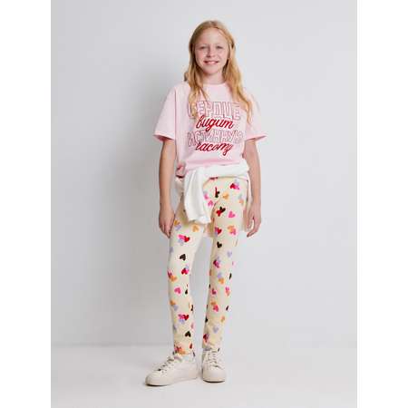 Хлопковые леггинсы — важный элемент детского гардероба девочки, который создан для удобных и стильных образов. Лосины для девочек выполнены из хлопкового трикотажного полотна с добавлением эластичных нитей, благодаря чему изделие подходит для длительного ношения и тянется, обеспечивая плотное прилегание. По линии талии расположена широкая эластичная резинка, за счет которой леггинсы комфортно садятся на разные типы фигуры. Лосины в кремовом цвете украшены принтом с разноцветными сердечками, что делает их модным и оригинальными. Изделие подходит для повседневного ношения, занятий спортом, подвижных игр или домашнего отдыха. Комбинируйте модель с подходящей футболкой (20240510052) и кедами, чтобы создать образ на каждый день.
