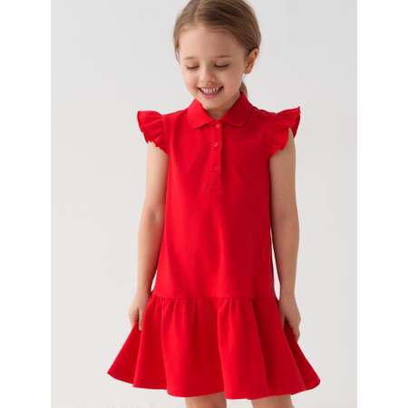 Летнее детское платье-поло для девочки. Выполнено из мягкого хлопкового трикотажа пике. Короткие рукава-крылышки, классический воротник поло и застежка на кнопки спереди. По низу — присборенная юбка, создающая нежный силуэт.