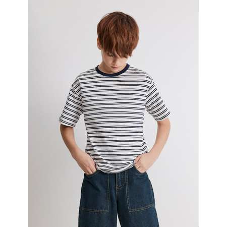 Детская полосатая футболка для мальчика универсальна и актуальна всегда. Модель изготовлена из натурального мягкого хлопка, который прекрасно подходит для ношения в течение всего дня. Футболка прямого силуэта с приспущенной линией плеча обеспечивает удобную свободную посадку для разных типов фигуры. Контрастная округлая горловина не мешает движениям. Узор в темно-синюю полоску придает образу заметный акцент, который также можно легко дополнить цветными аксессуарами. Стилизуйте футболку с оригинальными широкими джинсами с необычными карманами, чтобы составить модный и удобный образ на каждый день. Завершить лук помогут любимые кеды.