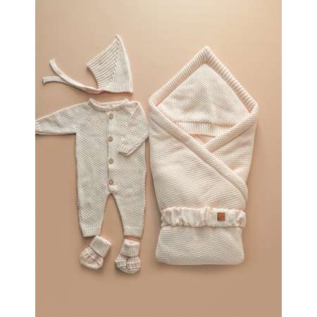 · Комбинезон, пинетки и чепчик на завязках – идеальные спутники для вашего малыша, выполненные из мягкого и дышащего хлопка. Они обеспечивают свободу движений и стильный внешний вид.