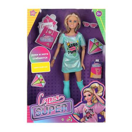 Суперстильная София одета в блестящее платье-футболку и высокие сапоги. Образ дополнен крупными серьгами и браслетами. Одежду и аксессуары легко снять и надеть. С такой модной куклой девочке будет интересно и весело играть: благодаря тому, что руки и ноги куклы подвижны, им можно придать любое положение. У Софии очень длинные красивые волосы, которые хозяйка куклы сможет заплетать в разные причёски.