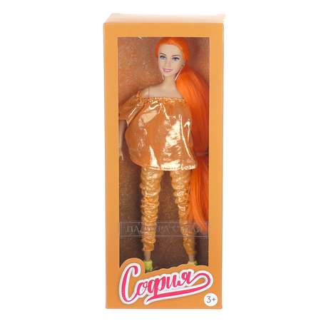 Модница София одета в стильный комплект в ярко-оранжевых тонах из блестящей ткани с перламутровым эффектом. Верх наряда — топ с чуть приспущенными рукавами, придающий образу лёгкость и современность. Низ представлен зауженными брюками с мягкими сборками, гармонирующими с верхом по цвету и фактуре. На ногах — элегантные туфли на каблуках в тон наряду, которые вместе с изящными серьгами идеально завершают яркий образ Софии. Одежда и аксессуары легко снимаются и надеваются. С такой очаровательной куклой девочке будет интересно и весело играть: благодаря тому, что руки и ноги куклы подвижны, им можно придать любое положение. У Софии красивые рыжие волосы, которые хозяйка куклы сможет заплетать в разные причёски. Детально проработанный дизайн игрушки вдохновит девочку на множество интересных игровых сюжетов.
