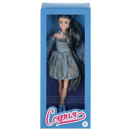 Модница София одета в стильное платье в чёрно-белую крапинку с верхний слоем из голубого фатина. Верх платья с открытыми плечами (на прозрачных бретелях), низ юбка-солнце с легкими складками. Воздушные прозрачные рукава добавляют образу лёгкости и изысканности. На ногах — кеды на высокой платформе в тон наряду, которые совместно с эффектным массивным ожерельем и изящными серьгами-кольцами гармонично завершают ультрамодный образ Софии. Одежда и аксессуары легко снимаются и надеваются. С такой очаровательной куклой девочке будет интересно и весело играть: благодаря тому, что руки и ноги куклы подвижны, им можно придать любое положение. У Софии длинные красивые волосы, которые хозяйка куклы сможет заплетать в разные причёски. Детально проработанный дизайн игрушки вдохновит девочку на множество интересных игровых сюжетов.