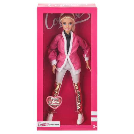 Модная спортсменка София одета в стильную розовую ветровку с белыми элементами, чёрный топ и белые с золотым легинсы. Образ куколки дополняют стильные серьги. Одежду и аксессуары легко снять и надеть. С такой модной куклой девочке будет интересно и весело играть: благодаря тому, что руки и ноги куклы подвижны, им можно придать любое положение. У Софии длинные красивые волосы, которые хозяйка куклы сможет заплетать в разные причёски. Детально проработанный дизайн игрушки вдохновит девочку на новые игровые сюжеты.
