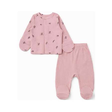 Комплект для девочки включает в себя: распашонка для девочки на кнопках и ползунки для девочки, пояс на резинке.