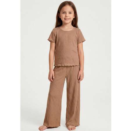 Пижама для девочки состоит из футболки и брюк. Пояс брюк на резинке.