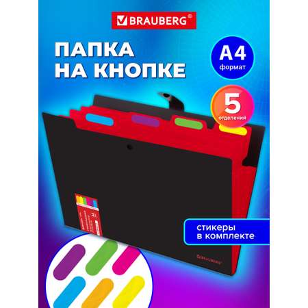 Папка-органайзер на кнопке 5 отделений BRAUBERG "Extra" – идеальное решение для хранения и систематизации документов в формате А4. Этот органайзер для документов А4 выполнен из прочного пластика с фактурой «песок» и оснащен удобным замком-кнопкой, который надежно защищает содержимое от пыли и влаги. Благодаря пяти отделениям с ярлыками и комплекту ярких стикеров поиск нужных бумаг становится быстрым и простым. Папка с файлами отлично подходит для хранения паспортов, дипломов, школьных тетрадей, важных документов, СНИЛС, студенеских курсовых работ и даже рисунков. Это незаменимый элемент канцелярии для офиса, который помогает поддерживать порядок в папках с документами и бумагах А4, что особенно важно для эффективного рабочего процесса и учебы в школе. Этот органайзер – незаменимый аксессуар среди канцелярских офисных принадлежностей для работы и учебы, который поможет поддерживать порядок и сохранять важные бумаги в целости.