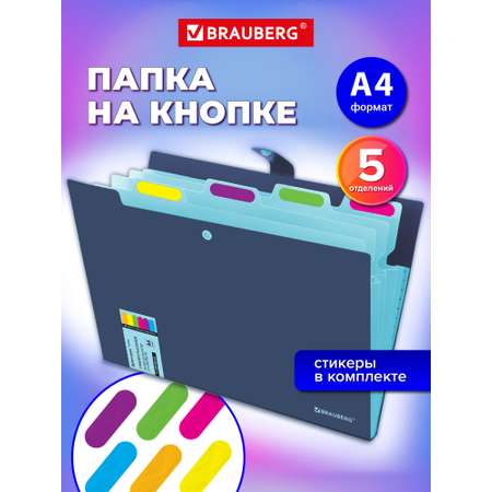 Папка-органайзер на кнопке 5 отделений BRAUBERG "Extra" – идеальное решение для хранения и систематизации документов в формате А4. Этот органайзер для документов А4 выполнен из прочного пластика с фактурой «песок» и оснащен удобным замком-кнопкой, который надежно защищает содержимое от пыли и влаги. Благодаря пяти отделениям с ярлыками и комплекту ярких стикеров поиск нужных бумаг становится быстрым и простым. Папка с файлами отлично подходит для хранения паспортов, дипломов, школьных тетрадей, важных документов, СНИЛС, студенеских курсовых работ и даже рисунков. Это незаменимый элемент канцелярии для офиса, который помогает поддерживать порядок в папках с документами и бумагах А4, что особенно важно для эффективного рабочего процесса и учебы в школе. Этот органайзер – незаменимый аксессуар среди канцелярских офисных принадлежностей для работы и учебы, который поможет поддерживать порядок и сохранять важные бумаги в целости.