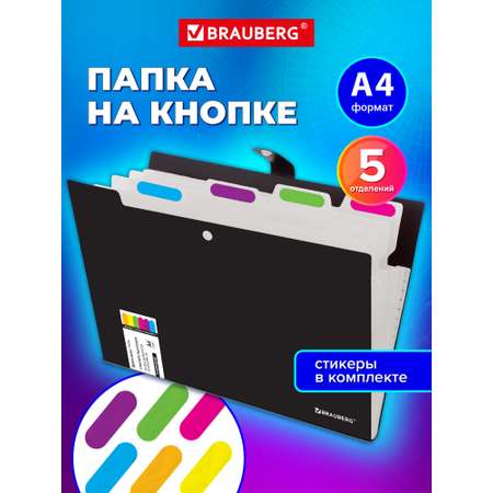 Папка-органайзер на кнопке 5 отделений BRAUBERG "Extra" – идеальное решение для хранения и систематизации документов в формате А4. Этот органайзер для документов А4 выполнен из прочного пластика с фактурой «песок» и оснащен удобным замком-кнопкой, который надежно защищает содержимое от пыли и влаги. Благодаря пяти отделениям с ярлыками и комплекту ярких стикеров поиск нужных бумаг становится быстрым и простым. Папка с файлами отлично подходит для хранения паспортов, дипломов, школьных тетрадей, важных документов, СНИЛС, студенеских курсовых работ и даже рисунков. Это незаменимый элемент канцелярии для офиса, который помогает поддерживать порядок в папках с документами и бумагах А4, что особенно важно для эффективного рабочего процесса и учебы в школе. Этот органайзер – незаменимый аксессуар среди канцелярских офисных принадлежностей для работы и учебы, который поможет поддерживать порядок и сохранять важные бумаги в целости.