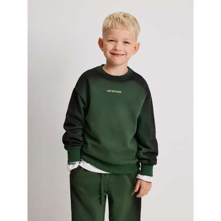 Зеленый свитшот c градиентным принтом для мальчика станет важной частью детского гардероба для создания образов на разные случаи. Свитшот выполнен из дышащего хлопкового футера с петлями внутри (без начеса), благодаря чему он подходит для ношения в теплую погоду и составления многослойных луков. Свитшот посадки comfort предполагает свободный крой, приспущенную линию плеча, а также увеличенные объем и длину рукава. Объемный модный крой позволяет легко двигаться, что особенно важно для активных непосед. Удобная округлая горловина, манжеты и низ изделия изготовлены из рибового полотна, что обеспечивает качественное прилегание и сохранение формы изделия. На рукава и горловину свитшота нанесен спрей-принт, который создает эффектный градиент, являющийся главным украшением модели. На груди расположена надпись "GET OUTSIDE" [англ. - "Выйти на улицу"]. Дополните свитшот брюками того же цвета, чтобы создать модный спортивный костюм для мальчика.