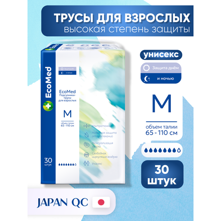 Взрослые подгузники-трусы EcoMed (ЭкоМед), размер M, объём талии 65-110 см (30 шт.) — надёжная защита и комфорт при недержании для мужчин и женщин. Ультратонкие трусы практически незаметны под одеждой и ощущаются как обычное нижнее бельё.