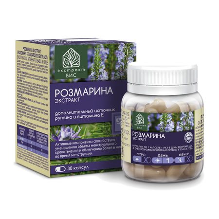 Активные компоненты экстракта розмарина способствуют уменьшению объема менструального кровотечения и облегчению болей в животе во время менструации. Витамин Е и рутин снижают перекисное окисление и способствуют облегчению симптомов дисменореи. В качестве биологически активной добавки к пище – дополнительного источника рутина и витамина Е, содержащей розмариновую кислоту. """Экстракт ВИС"" - российский бренд растительных биодобавок для поддержки здоровья.