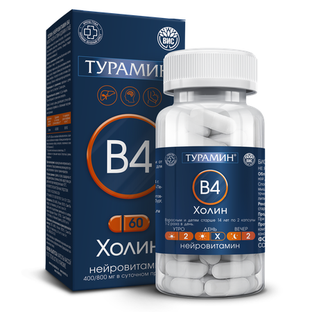 Турамин ХОЛИН (Нейровитамин В4) в виде холина битартрата способствует правильному функционированию печени, мышц и мозга; липидного обмена; восстановлению клеточных мембран, участвует в синтезе холиновых фосфолипидов, бетаина и нейромедиатора ацетилхолина.