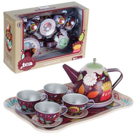 В наборе поднос, чайник с крышкой, 4 чашки, 4 тарелки, 4 блюдца. У чайника снимается крышка, можно налить воду в чайник и чашки. Игрушечная металлическая посудка включает в себя 15 предметов.