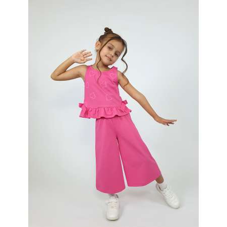 Нарядный трикотажный костюм с брюками от бренда Luneva – идеальный выбор для стильных и элегантных девочек. Яркий летний комплект двойка туники с бриджами подойдет как для торжественных мероприятий, так и для повседневной носки. Данная модель выполнена из 100% хлопка, который является гипоаллергенным материалом, что особенно важно для нежной кожи ребенка. Широкие палаццо обеспечивают максимальную свободу движений, а также делает образ легким и воздушным. Они оснащены мягкой резинкой. Топ с баской, придаёт образу кокетливости и элегантности. Благодаря нейтральному принту с сердечками, костюм подойдет как для прогулок с друзьями, так и для праздничной фотосессии. Такой свободный фасон подойдет как на высокий, так и на маленький рост. Базовый летний комплект со штанами станет оригинальным подарком для дочки или внучки на день рождения или любой другой праздник. Для того чтобы изделие радовало Вашего ребенка дольше, мы рекомендуем деликатную стирку при t не более 30С с использованием смягчающих средств. Носите с удовольствием, будем рады вашим отзывам.