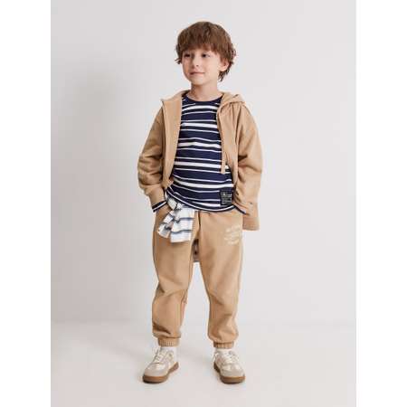 Спортивные брюки для мальчика станут отличной основой для спортивных и повседневных образов. Брюки-джоггеры выполнены из хлопкового футера с петлями на изнаночной стороне (без начеса), что позволяет использовать их для занятий спортом. Широкий эластичный пояс на резинке комфортно садится на разные типы фигуры и дополнительно регулируется шнурком. Брюки с боковыми карманами удобны и практичны в повседневном ношении; на спинке нашит дополнительный накладной карман. Низ брючин собран на резинку для лучшего прилегания и сохранения объемной формы изделия. Хлопковые джоггеры украшены принтом с надписью "NO SCREENS | WELL IT'S TIME TO EXPLORE, BUILD, DISCOVER AND ROAM | OFFLINE MODE| NO WORRIES" [англ. - "Без экранов | Ну что ж, пора исследовать, строить, открывать и бродить | Автономный режим | Не беспокоить"]. Модель представлена в двух цветах: красном и серо-бежевом. Дополните брюки комплектной толстовкой (20121000058), чтобы собрать стильный спортивный костюм для мальчика.