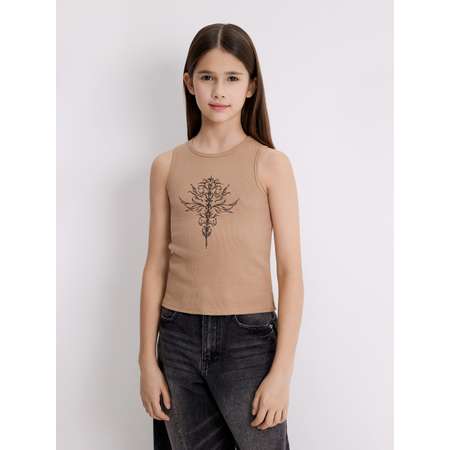 Коричневая майка-топ для девочки — это стильный айтем для создания легких повседневных образов. Модель выполнена из эластичного хлопкового риба, который обеспечивает удобную посадку по фигуре, комфортное ношение и плотное прилегание к телу. Линии пройм и округлой горловины с дополнительной обработкой, которая делает ношение ещё удобнее. Спереди модель украшена черным узором из тонких линий, поверх которой расположены мерцающие стразы, придающие дополнительный акцент всему образу. Актуальный коричневый цвет станет интересной альтернативой черному в грядущем сезоне. Топ со стразами для девочки-подростка составит стильный лук с широкими джинсами, серым худи и повязанным на талию лонгсливом (202301500230).