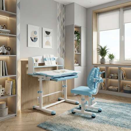 Растущий стол парта трансформер для школьника LOTT R6 OXFORD - комплект со стулом бело-голубого цвета для мальчика, надстройкой секретером и подставка книг, ширина до 80см