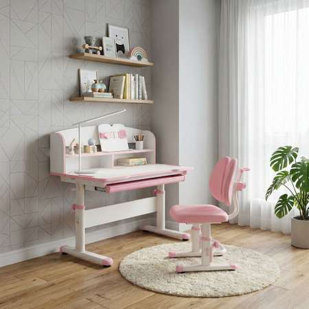 Добротный и основательно сделанный комплект (розового цвета для девочки) парты с 2х ярусной книжной полкой секретером в комплекте со стулом. Поставляется вместе с регулируемой подставкой для книг, мобильных телефонов, планшетов и т.д.
