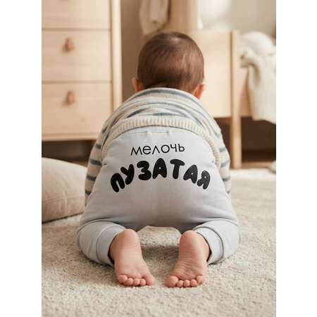 Ползунки для мальчика до года. Штанишки для мальчика продуманы таким образом, чтобы стать универсальным выбором среди родителей, стремящихся к простоте и функциональности. Нежный серый цвет и игривая надпись "Мелочь пузатая" создают неповторимый образ. Пусть все знают, что ваш малыш – самый любимый!