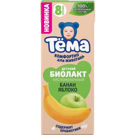 Встречайте новинку - детский биолакт Тёма Банан-яблоко. Наш биолакт создан с любовью и вниманием к потребностям самых маленьких (с восьми месяцев). Яркий вкус спелого банана и сочного яблока точно понравится вашему малышу. Мягкий вкус и пробиотики в составе позаботятся о комфорте в маленьком животике. • Пробиотики для комфортного пищеварения • 100% натуральный состав • Мягкий вкус Тёма – чувствуй заботу животиком!