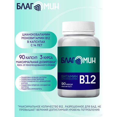 БЛАГОМИН В12 – дополнительный источник витамина В12 (цианокобаламина). В 1 капсуле БЛАГОМИН В12 содержится 9 мкг цианокобаламина, что составляет 900% от рекомендуемого уровня суточного потребления (не превышает верхний допустимый уровень потребления). Разрешен к применению с 14 лет. Одной упаковки 90 капсул достаточно для 3 курсов применения.