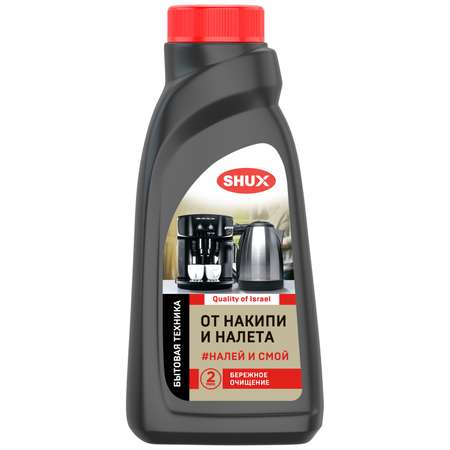 Высоко кислотное средство для очищения накипи и известковых отложений в водонагревательных приборах, кофемашинах, чайниках, очистителях воздуха, увлажнителях. Инновационная формула SHUX всего за 2 минуты очищает окаменевший известковый налет, накипь, ржавчину, мелкую известковую взвесь в чайниках, кофеварках и кофемашинах, бойлерах, парогенераторах, увлажнителях и очистителях воздуха, пластиковых емкостях и др. Высокая концентрация состава позволяет экономично расходовать средство. Безопасно для применения во внутренних элементах бытовой техники. Регулярное использование защищает от накипи и налета водонагревательные детали бытовой техники, что способствует продлению срока службы. Не содержит агрессивных кислот, работает быстро и деликатно. Основа состава – смесь органических кислот и функциональных добавок.
