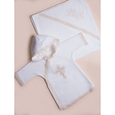 Торжественный крестильный набор создан для самого важного события в жизни малыша — Таинства Крещения. Комплект состоит из двух незаменимых предметов: удлиненной крестильной рубашки с капюшоном и большой пеленки с уголком. Изделия выполнены из мягкого 100% хлопка, который моментально впитывает влагу и дарит комфорт нежной коже младенца после купели. Рубашка для крещения имеет свободный крой и удобные завязки, позволяя быстро и легко переодеть ребенка. Капюшон защитит голову малыша от сквозняков в храме, а изящная вышивка в виде креста придает образу особую святость. Пеленка с уголком (крыжма) декорирована нежным кружевом и вышивкой, она идеально подходит для принятия ребенка из рук священника и проведения праздничной фотосессии. Этот комплект для крещения станет прекрасным подарком от крестных родителей. Натуральная ткань гипоаллергенна, отлично переносит стирку и сохраняется как семейная реликвия на долгие годы. Подходит как для мальчика, так и для девочки (унисекс).